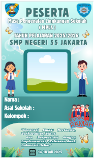 - Unduh file ID Card, ketikkan/tuliskan nama lengkap, asal sekolah dan nama kelompok lalu cetak sesuai ukuran ID Card.